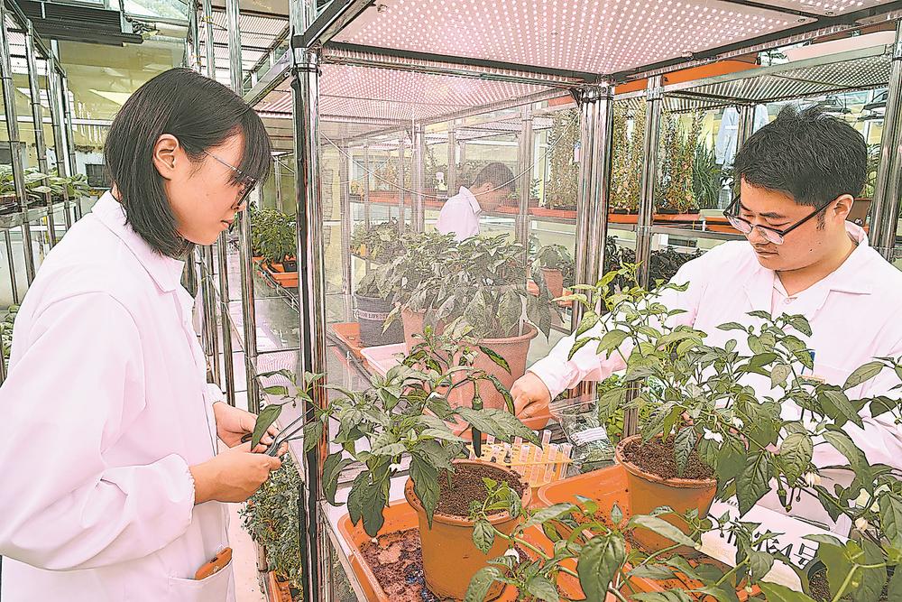 福建农林大学通过多种体例提拔学生专业技术。图为10月14日,该校聪慧农业尝试室内,学生对种植的辣椒进行采样检测。记者 逛庆辉 摄。