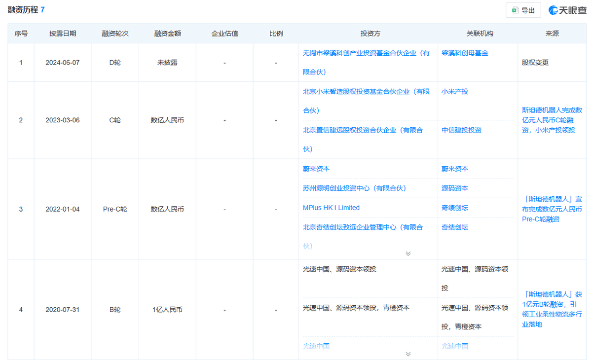 斯坦德机械人打算根据为特专科技公司量身定制的“18C章程”寻求上市,按照买卖所18C章的相关,特专科技公司须满脚必然的收益门槛。斯坦德机械人于2024年方才达到这一要求。若成功上市,斯坦德机械人将成为“工业具身智能第一股”。斯坦德机械人将本人定位为“全球领先的工业智能挪动机械人处理方案供给商”,同时也是“供给工业具身智能机械人处理方案的”。按照灼识征询的材料, 截至2024年12月31日的年度,按销量计较,公司为中国四大工业智能挪动机械人处理方案供给商,市场份额为3。2%。这一市场地位得益于公司领先的手艺能力和产物处理方案。招股书显示,其焦点计心情器人手艺平台包罗焦点节制器、自研操做系统SROS及算法;机械人产物包罗尺度型机械人、功能性机械人和具身智能机械人。目前,正在全球具有跨越400名客户,此中很多客户是各自范畴的龙头企业,包罗小米汽车、比亚迪、蔚来等。成立至今,斯坦德机械人共完成7轮融资,投资方包罗国科嘉禾、松禾本钱、源码本钱、光速光合、奇绩创坛、蔚来本钱、中信建投、小米等。最初一轮披露于2024年6月的D轮融资,投资方为博华本钱旗下梁溪投资,投后估值为21亿元。